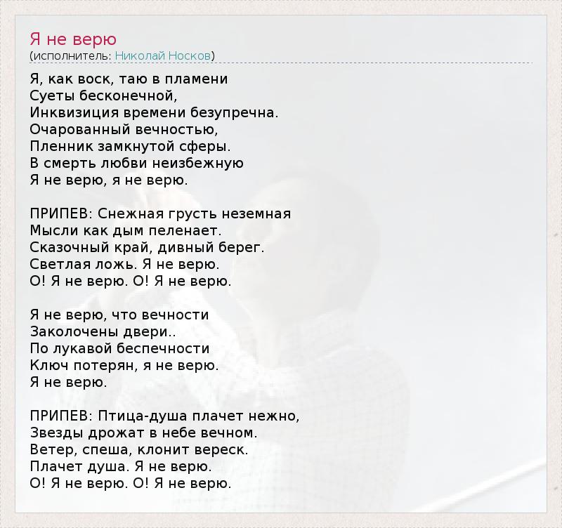Я, как воск, таю в пламени Суеты бесконечной, Инквизиция времени безупречна. Очарованный вечностью, Пленник замкнутой сферы. В смерть любви неизбежную Я не верю, я не верю. ПРИПЕВ: Снежная грусть неземная Мысли как дым пеленает. Сказочный край, дивный берег. Светлая ложь. Я не верю. О! Я не верю. О! Я не верю. Я не верю, что вечности Заколочены двери.. По лукавой беспечности Ключ потерян, я не верю. Я не верю. ПРИПЕВ: Птица-душа плачет нежно, Звезды дрожат в небе вечном. Ветер, спеша, клонит вереск. Плачет душа. Я не верю. О! Я не верю. О! Я не верю.