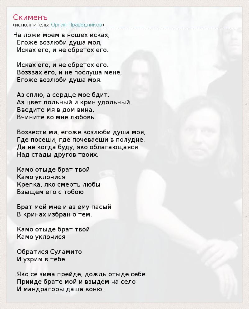 На ложи моем в нощех исках, Егоже возлюби душа моя, Исках его, и не обретох его. Исках его, и не обретох его. Воззвах его, и не послуша мене, Егоже возлюби душа моя. Аз сплю, а сердце мое бдит. Аз цвет польный и крин удольный. Введите мя в дом вина, Вчините ко мне любовь. Возвести ми, егоже возлюби душа моя, Где посеши, где почеваеши в полудне. Да не когда буду, яко облагающаяся Над стады другов твоих. Камо отыде брат твой Камо уклонися Крепка, яко смерть любы Взыщем его с тобою Брат мой мне и аз ему пасый В кринах избран о тем. Камо отыде брат твой Камо уклонися Обратися Суламито И узрим в тебе Яко се зима прейде, дождь отыде себе Прииде брате мой и взыдем на село И мандрагоры даша воню.