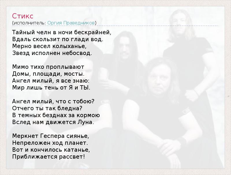 Это интересно:Московская группа "Оргия Праведников" образовалась в 1999 году путем слияния творческих потенциалов арт-роковой команды "Артель" и поэта и гитариста Сергея Калугина. Своеобразный саунд группы определяется оригинальным сочетанием акустической (флейта и акустическая гитара) и электрической (ударные, электрогитара и бас) секций.С момента образования группа декларировала... продолжение