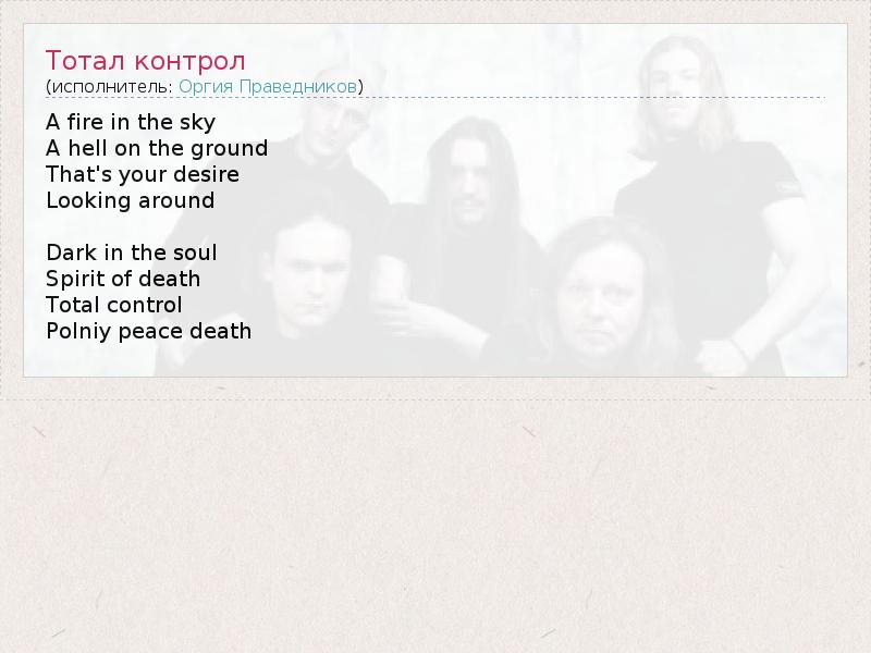 A fire in the sky A hell on the ground That's your desire Looking around Dark in the soul Spirit of death Total control Polniy peace death