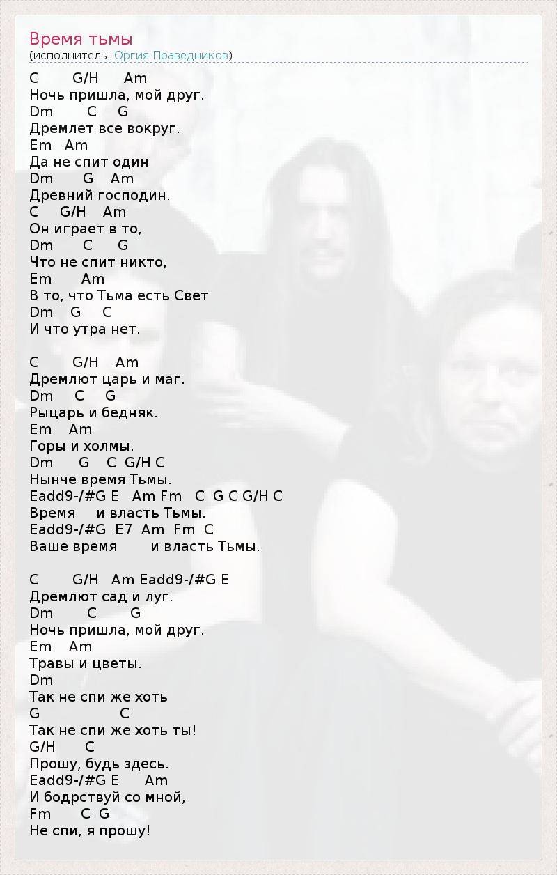 C G/H Am Ночь пришла, мой друг. Dm C G Дремлет все вокруг. Em Am Да не спит один Dm G Am Древний господин. C G/H Am Он играет в то, Dm C G Что не спит никто, Em Am В то, что Тьма есть Свет Dm G C И что утра нет. C G/H Am Дремлют царь и маг. Dm C G Рыцарь и бедняк. Em Am Горы и холмы. Dm G C G/H C Нынче время Тьмы. Eadd9-/#G E Am Fm C G C G/H C Время и власть Тьмы. Eadd9-/#G E7 Am Fm C Ваше время и власть Тьмы. C G/H Am Eadd9-/#G E Дремлют сад и луг. Dm C G Ночь пришла, мой друг. Em Am Травы и цветы. Dm Так не спи же хоть G C Так не спи же хоть ты! G/H C Прошу, будь здесь. Eadd9-/#G E Am И бодрствуй со мной, Fm C G Не спи, я прошу!
