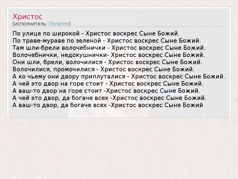 По улице по широкой - Христос воскрес Сыне Божий. По траве-мураве по зеленой - Христос воскрес Сыне Божий. Там шли-брели волочебнички - Христос воскрес Сыне Божий. Волочебнички, недокушнички- Христос воскрес Сыне Божий. Они шли, брели, волочилися - Христос воскрес Сыне Божий. Волочилися, промочилися - Христос воскрес Сыне Божий. А ко чьему они двору приплуталися - Христос воскрес Сыне Божий. А чей это двор на горе стоит - Христос воскрес Сыне Божий. А ваш-то двор на горе стоит -Христос воскрес Сыне Божий. А чей это двор, да богаче всех -Христос воскрес Сыне Божий. А ваш-то двор, да богаче всех -Христос воскрес Сыне Божий