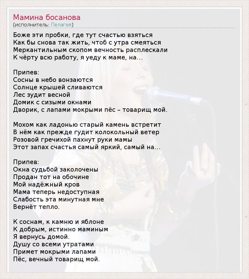 Боже эти пробки, где тут счастью взяться Как бы снова так жить, чтоб с утра смеяться Меркантильным скопом вечность расплескали К чёрту всю работу, я уеду к маме, на… Припев: Сосны в небо вонзаются Солнце крышей сливаются Лес зудит весной Домик с сизыми окнами Дворик, с лапами мокрыми пёс – товарищ мой. Мохом как ладонью старый камень встретит В нём как прежде гудит колокольный ветер Розовой гречихой пахнут руки мамы Этот запах счастья самый яркий, самый на… Припев: Окна судьбой заколочены Продан тот на обочине Мой надёжный кров Мама теперь недоступная Слабость эта минутная мне Вернёт тепло. К соснам, к камню и яблоне К добрым, истинно маминым Я вернусь домой. Душу со всеми утратами Примет мокрыми лапами Пёс, вечный товарищ мой.