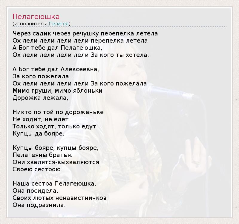 Через садик через речушку перепелка летела Ох лели лели лели лели перепелка летела А Бог тебе дал Пелагеюшка, Ох лели лели лели лели За кого ты хотела. А Бог тебе дал Алексеевна, За кого пожелала. Ох лели лели лели лели За кого пожелала Мимо груши, мимо яблоньки Дорожка лежала, Никто по той по дороженьке Не ходит, не едет. Только ходят, только едут Купцы да бояре. Купцы-бояре, купцы-бояре, Пелагеяны братья. Они хвалятся-выхваляются Своею сестрою. Наша сестра Пелагеюшка, Она посидела. Своих лютых ненавистничков Она подразнила.