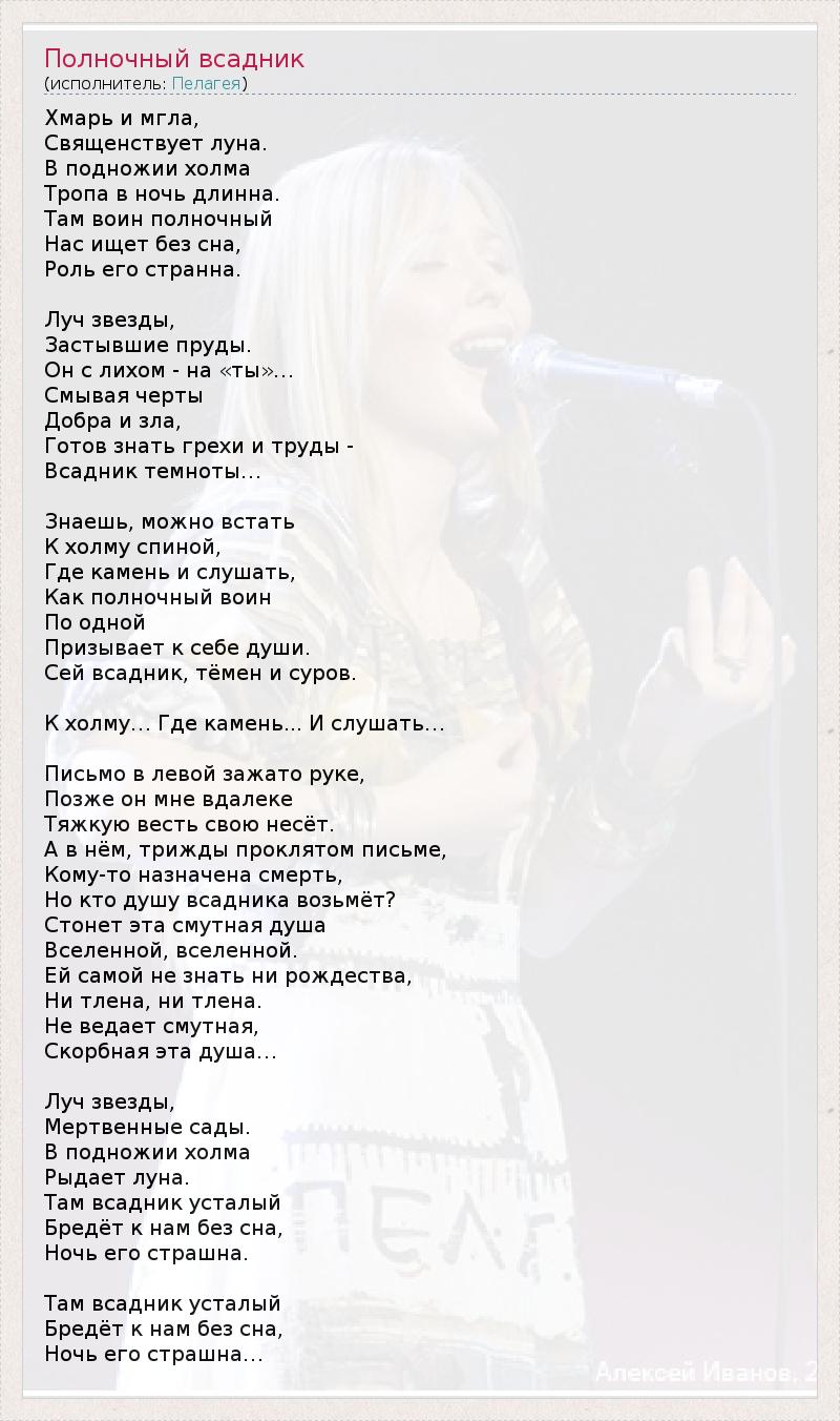 Хмарь и мгла, Священствует луна. В подножии холма Тропа в ночь длинна. Там воин полночный Нас ищет без сна, Роль его странна. Луч звезды, Застывшие пруды. Он с лихом - на «ты»… Смывая черты Добра и зла, Готов знать грехи и труды - Всадник темноты… Знаешь, можно встать К холму спиной, Где камень и слушать, Как полночный воин По одной Призывает к себе души. Сей всадник, тёмен и суров. К холму… Где камень... И слушать… Письмо в левой зажато руке, Позже он мне вдалеке Тяжкую весть свою несёт. А в нём, трижды проклятом письме, Кому-то назначена смерть, Но кто душу всадника возьмёт? Стонет эта смутная душа Вселенной, вселенной. Ей самой не знать ни рождества, Ни тлена, ни тлена. Не ведает смутная, Скорбная эта душа… Луч звезды, Мертвенные сады. В подножии холма Рыдает луна. Там всадник усталый Бредёт к нам без сна, Ночь его страшна. Там всадник усталый Бредёт к нам без сна, Ночь его страшна…