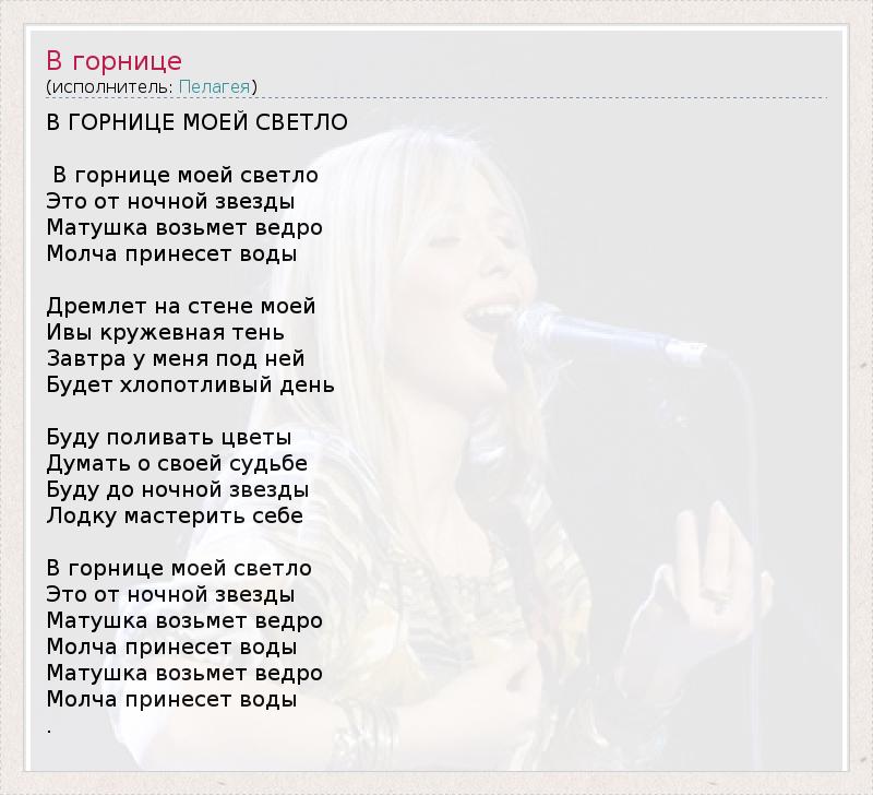 В ГОРНИЦЕ МОЕЙ СВЕТЛО В горнице моей светло Это от ночной звезды Матушка возьмет ведро Молча принесет воды Дремлет на стене моей Ивы кружевная тень Завтра у меня под ней Будет хлопотливый день Буду поливать цветы Думать о своей судьбе Буду до ночной звезды Лодку мастерить себе В горнице моей светло Это от ночной звезды Матушка возьмет ведро Молча принесет воды Матушка возьмет ведро Молча принесет воды .