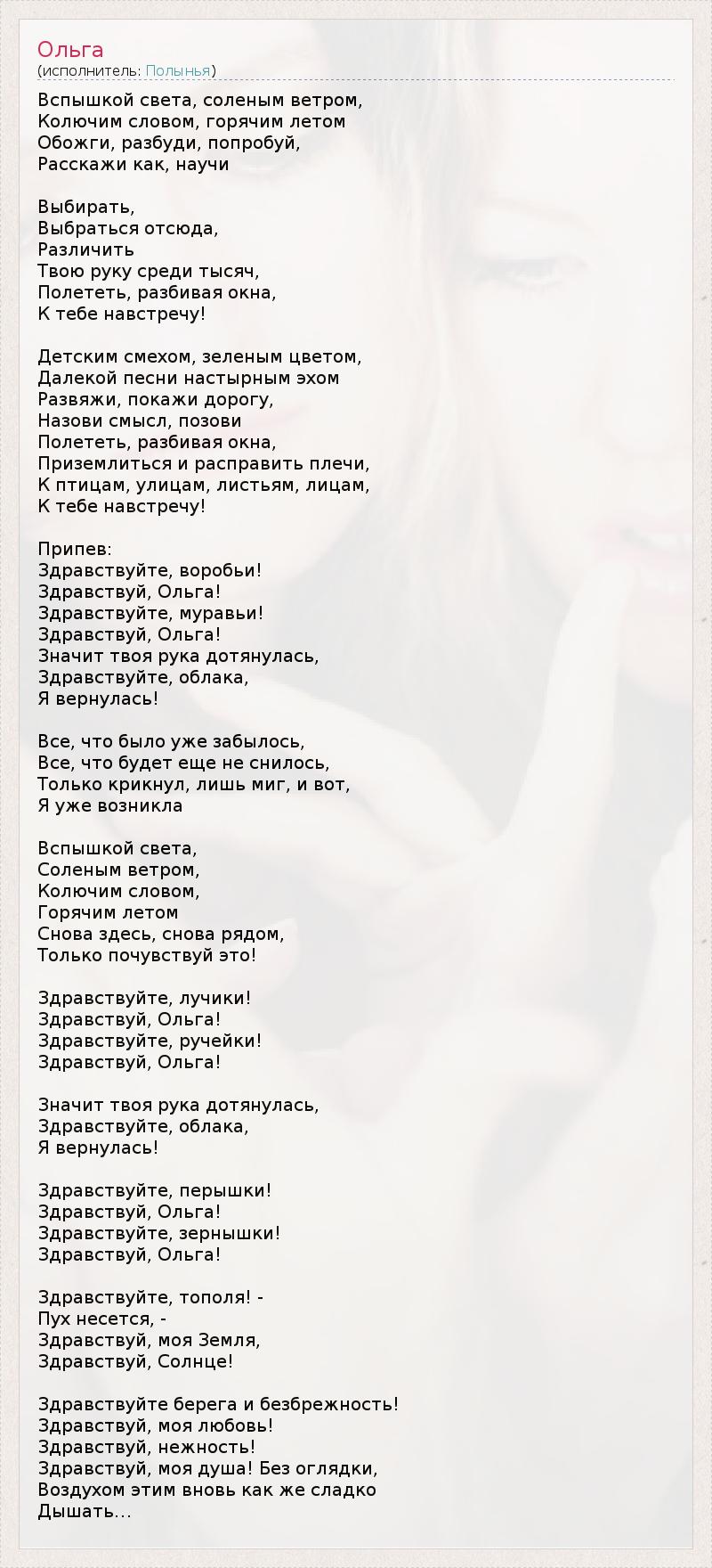 Вспышкой света, соленым ветром, Колючим словом, горячим летом Обожги, разбуди, попробуй, Расскажи как, научи Выбирать, Выбраться отсюда, Различить Твою руку среди тысяч, Полететь, разбивая окна, К тебе навстречу! Детским смехом, зеленым цветом, Далекой песни настырным эхом Развяжи, покажи дорогу, Назови смысл, позови Полететь, разбивая окна, Приземлиться и расправить плечи, К птицам, улицам, листьям, лицам, К тебе навстречу! Припев: Здравствуйте, воробьи! Здравствуй, Ольга! Здравствуйте, муравьи! Здравствуй, Ольга! Значит твоя рука дотянулась, Здравствуйте, облака, Я вернулась! Все, что было уже забылось, Все, что будет еще не снилось, Только крикнул, лишь миг, и вот, Я уже возникла Вспышкой света, Соленым ветром, Колючим словом, Горячим летом Снова здесь, снова рядом, Только почувствуй это! Здравствуйте, лучики! Здравствуй, Ольга! Здравствуйте, ручейки! Здравствуй, Ольга! Значит твоя рука дотянулась, Здравствуйте, облака, Я вернулась! Здравствуйте, перышки! Здравствуй, Ольга! Здравствуйте, зернышки! Здравствуй, Ольга! Здравствуйте, тополя! - Пух несется, - Здравствуй, моя Земля, Здравствуй, Солнце! Здравствуйте берега и безбрежность! Здравствуй, моя любовь! Здравствуй, нежность! Здравствуй, моя душа! Без оглядки, Воздухом этим вновь как же сладко Дышать…