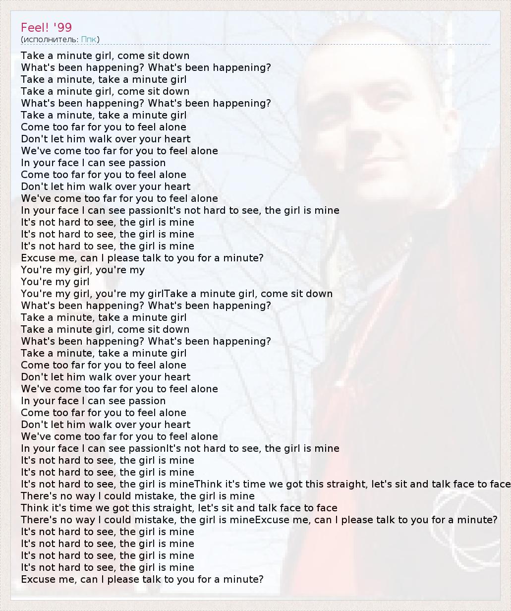 Take a minute girl, come sit down What's been happening? What's been happening? Take a minute, take a minute girl Take a minute girl, come sit down What's been happening? What's been happening? Take a minute, take a minute girl Come too far for you to feel alone Don't let him walk over your heart We've come too far for you to feel alone In your face I can see passion Come too far for you to feel alone Don't let him walk over your heart We've come too far for you to feel alone In your face I can see passionIt's not hard to see, the girl is mine It's not hard to see, the girl is mine It's not hard to see, the girl is mine It's not hard to see, the girl is mine Excuse me, can I please talk to you for a minute? You're my girl, you're my You're my girl You're my girl, you're my girlTake a minute girl, come sit down What's been happening? What's been happening? Take a minute, take a minute girl Take a minute girl, come sit down What's been happening? What's been happening? Take a minute, take a minute girl Come too far for you to feel alone Don't let him walk over your heart We've come too far for you to feel alone In your face I can see passion Come too far for you to feel alone Don't let him walk over your heart We've come too far for you to feel alone In your face I can see passionIt's not hard to see, the girl is mine It's not hard to see, the girl is mine It's not hard to see, the girl is mine It's not hard to see, the girl is mineThink it's time we got this straight, let's sit and talk face to face There's no way I could mistake, the girl is mine Think it's time we got this straight, let's sit and talk face to face There's no way I could mistake, the girl is mineExcuse me, can I please talk to you for a minute? It's not hard to see, the girl is mine It's not hard to see, the girl is mine It's not hard to see, the girl is mine It's not hard to see, the girl is mine Excuse me, can I please talk to you for a minute?