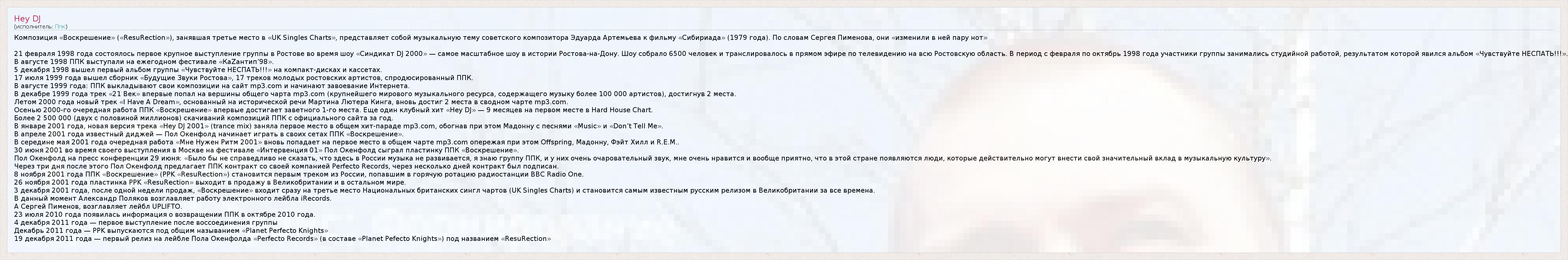 В апреле 2001 года известный диджей — Пол Окенфолд начинает играть в своих сетах ППК «Воскрешение».