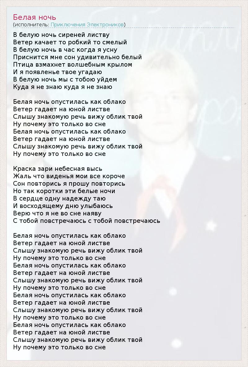 В белую ночь сиреней листву Ветер качает то робкий то смелый В белую ночь в час когда я усну Приснится мне сон удивительно белый Птица взмахнет волшебным крылом И я появленье твое угадаю В белую ночь мы с тобою уйдем Куда я не знаю куда я не знаю Белая ночь опустилась как облако Ветер гадает на юной листве Слышу знакомую речь вижу облик твой Ну почему это только во сне Белая ночь опустилась как облако Ветер гадает на юной листве Слышу знакомую речь вижу облик твой Ну почему это только во сне Краска зари небесная высь Жаль что виденья мои все короче Сон повторись я прошу повторись Но так коротки эти белые ночи В сердце одну надежду таю И восходящему дню улыбаюсь Верю что я не во сне наяву С тобой повстречаюсь с тобой повстречаюсь Белая ночь опустилась как облако Ветер гадает на юной листве Слышу знакомую речь вижу облик твой Ну почему это только во сне Белая ночь опустилась как облако Ветер гадает на юной листве Слышу знакомую речь вижу облик твой Ну почему это только во сне Белая ночь опустилась как облако Ветер гадает на юной листве Слышу знакомую речь вижу облик твой Ну почему это только во сне Белая ночь опустилась как облако Ветер гадает на юной листве Слышу знакомую речь вижу облик твой Ну почему это только во сне