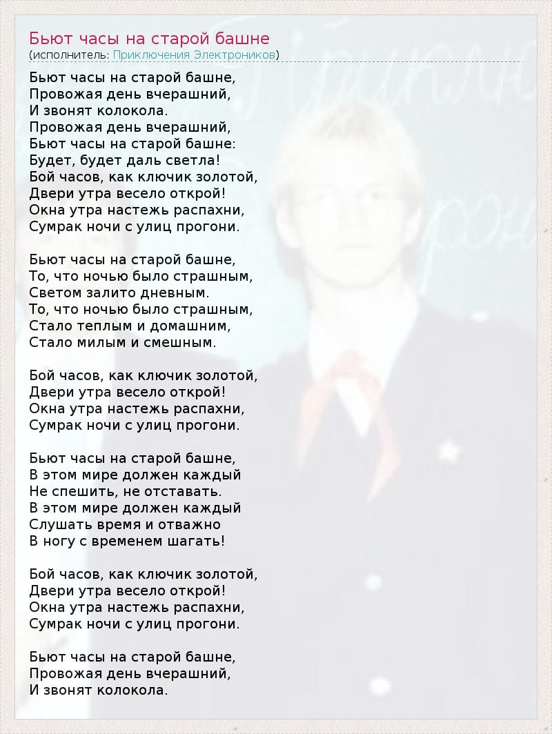 Бьют часы на старой башне, Провожая день вчерашний, И звонят колокола. Провожая день вчерашний, Бьют часы на старой башне: Будет, будет даль светла! Бой часов, как ключик золотой, Двери yтра весело открой! Окна yтpа настежь распахни, Сyмpак ночи с улиц прогони. Бьют часы на старой башне, То, что ночью было страшным, Светом залито дневным. То, что ночью было страшным, Стало теплым и домашним, Стало милым и смешным. Бой часов, как ключик золотой, Двери yтра весело открой! Окна yтpа настежь распахни, Сyмpак ночи с улиц прогони. Бьют часы на старой башне, В этом мире должен каждый Не спешить, не отставать. В этом мире должен каждый Слушать время и отважно В ногу с временем шагать! Бой часов, как ключик золотой, Двери yтра весело открой! Окна yтpа настежь распахни, Сyмpак ночи с улиц прогони. Бьют часы на старой башне, Провожая день вчерашний, И звонят колокола.