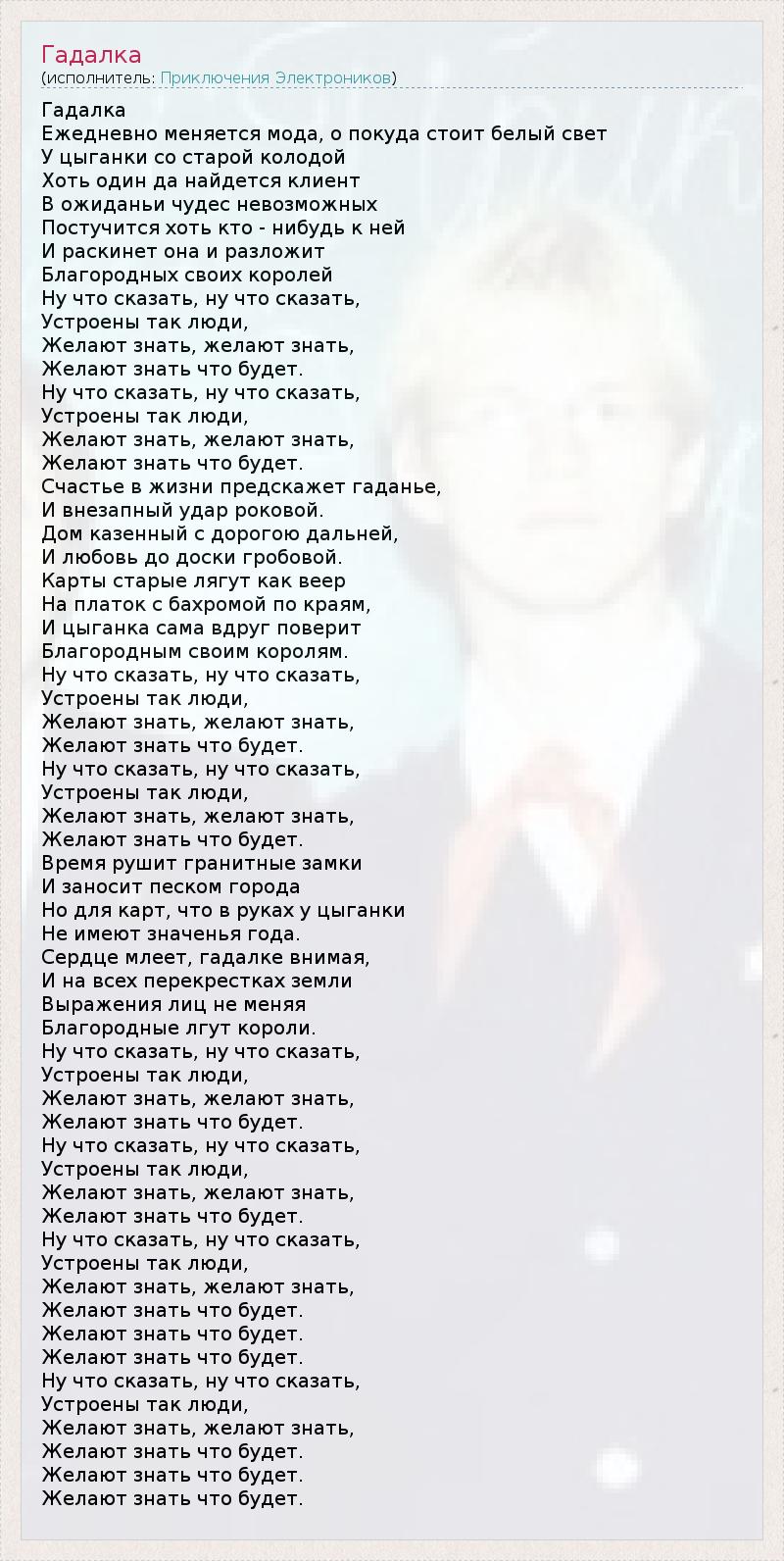 Гадалка Ежедневно меняется мода, о покуда стоит белый свет У цыганки со старой колодой Хоть один да найдется клиент В ожиданьи чудес невозможных Постучится хоть кто - нибудь к ней И раскинет она и разложит Благородных своих королей Hу что сказать, ну что сказать, Устроены так люди, Желают знать, желают знать, Желают знать что будет. Hу что сказать, ну что сказать, Устроены так люди, Желают знать, желают знать, Желают знать что будет. Счастье в жизни предскажет гаданье, И внезапный удар роковой. Дом казенный с дорогою дальней, И любовь до доски гробовой. Карты старые лягут как веер Hа платок с бахромой по краям, И цыганка сама вдруг поверит Благородным своим королям. Hу что сказать, ну что сказать, Устроены так люди, Желают знать, желают знать, Желают знать что будет. Hу что сказать, ну что сказать, Устроены так люди, Желают знать, желают знать, Желают знать что будет. Время рушит гранитные замки И заносит песком города Hо для карт, что в руках у цыганки Hе имеют значенья года. Сердце млеет, гадалке внимая, И на всех перекрестках земли Выражения лиц не меняя Благородные лгут короли. Hу что сказать, ну что сказать, Устроены так люди, Желают знать, желают знать, Желают знать что будет. Hу что сказать, ну что сказать, Устроены так люди, Желают знать, желают знать, Желают знать что будет. Hу что сказать, ну что сказать, Устроены так люди, Желают знать, желают знать, Желают знать что будет. Желают знать что будет. Желают знать что будет. Hу что сказать, ну что сказать, Устроены так люди, Желают знать, желают знать, Желают знать что будет. Желают знать что будет. Желают знать что будет.