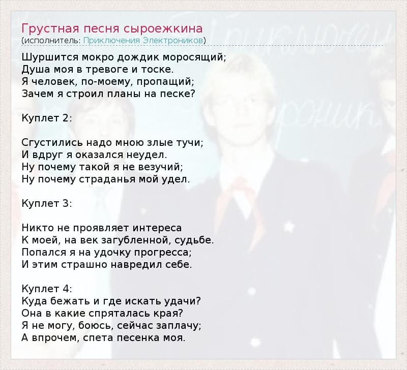 ГлавнаяИсполнителиПриключения ЭлектрониковГрустная песня сыроежкина