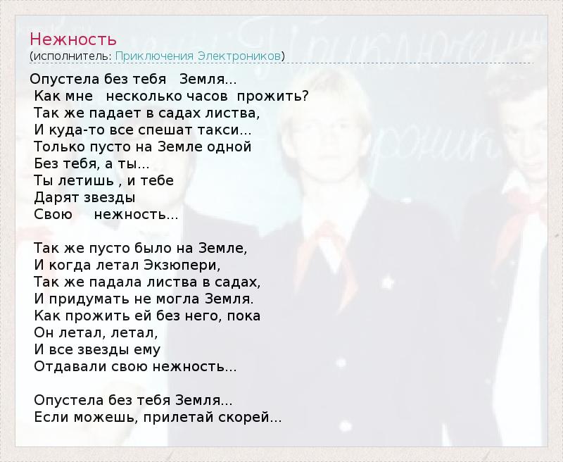 Опустела без тебя Земля... Как мне несколько часов прожить? Так же падает в садах листва, И куда-то все спешат такси... Только пусто на Земле одной Без тебя, а ты... Ты летишь , и тебе Дарят звезды Свою нежность... Так же пусто было на Земле, И когда летал Экзюпери, Так же падала листва в садах, И придумать не могла Земля. Как прожить ей без него, пока Он летал, летал, И все звезды ему Отдавали свою нежность... Опустела без тебя Земля... Если можешь, прилетай скорей...
