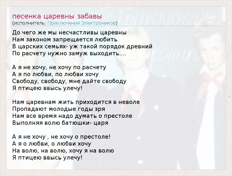 А как ты думаешь, о чем песня "песенка царевны забавы" ?