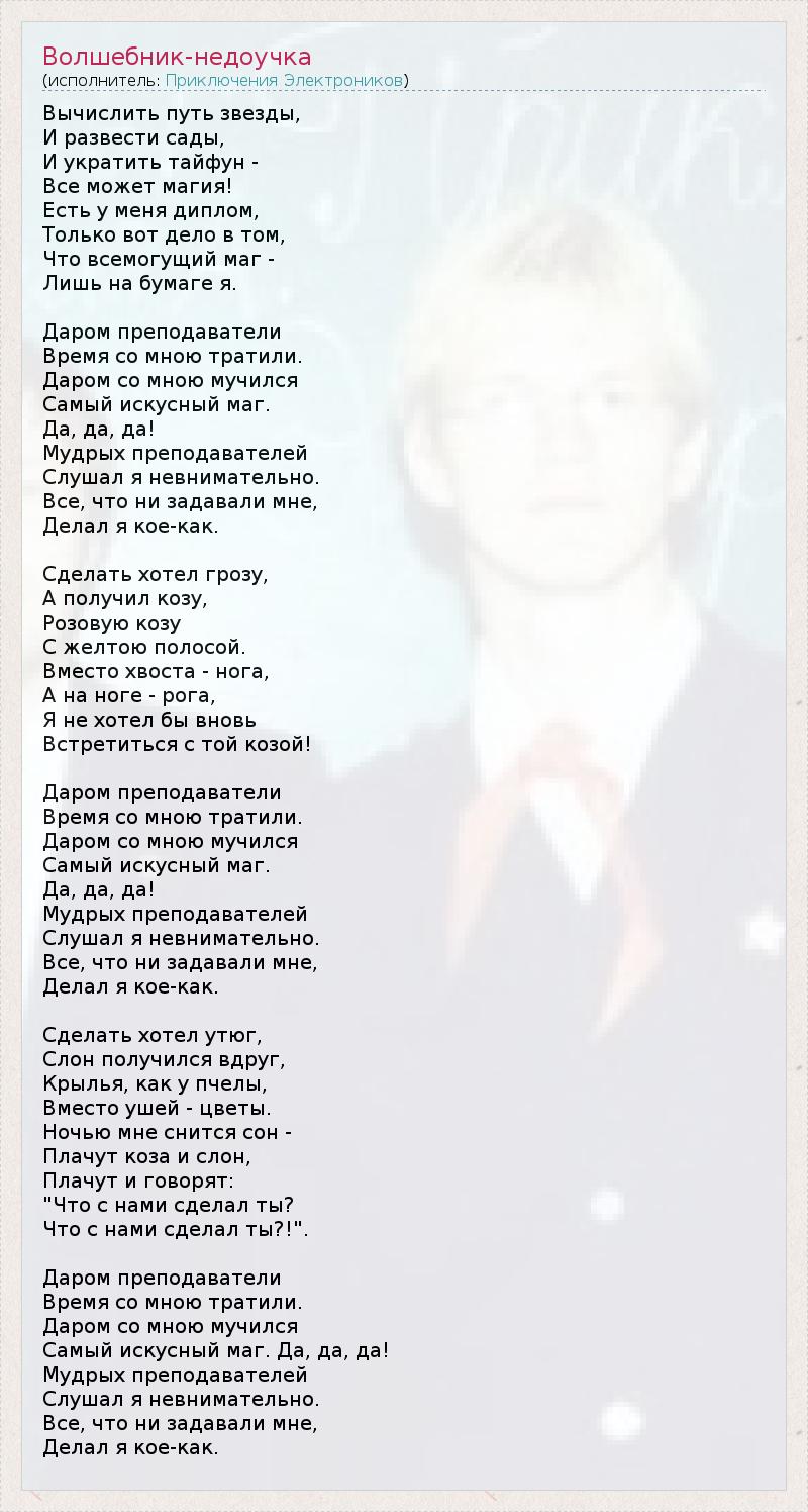 Вычислить путь звезды, И развести сады, И укратить тайфун - Все может магия! Есть у меня диплом, Только вот дело в том, Что всемогущий маг - Лишь на бумаге я. Даром преподаватели Время со мною тратили. Даром со мною мучился Самый искусный маг. Да, да, да! Мудрых преподавателей Слушал я невнимательно. Все, что ни задавали мне, Делал я кое-как. Сделать хотел грозу, А получил козу, Розовую козу С желтою полосой. Вместо хвоста - нога, А на ноге - рога, Я не хотел бы вновь Встретиться с той козой! Даром преподаватели Время со мною тратили. Даром со мною мучился Самый искусный маг. Да, да, да! Мудрых преподавателей Слушал я невнимательно. Все, что ни задавали мне, Делал я кое-как. Сделать хотел утюг, Слон получился вдруг, Крылья, как у пчелы, Вместо ушей - цветы. Ночью мне снится сон - Плачут коза и слон, Плачут и говорят: "Что с нами сделал ты? Что с нами сделал ты?!". Даром преподаватели Время со мною тратили. Даром со мною мучился Самый искусный маг. Да, да, да! Мудрых преподавателей Слушал я невнимательно. Все, что ни задавали мне, Делал я кое-как.