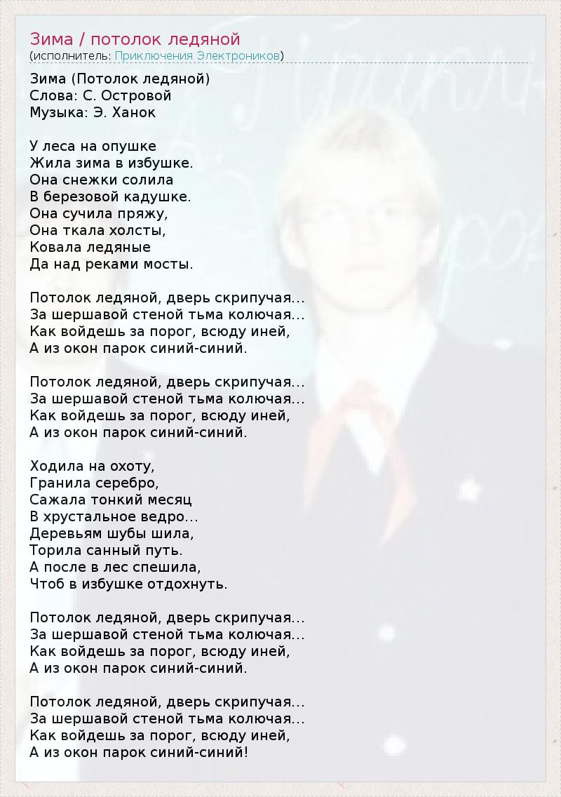 Зима (Потолок ледяной) Слова: С. Островой Музыка: Э. Ханок У леса на опушке Жила зима в избушке. Она снежки солила В березовой кадушке. Она сучила пряжу, Она ткала холсты, Ковала ледяные Да над реками мосты. Потолок ледяной, дверь скрипучая… За шершавой стеной тьма колючая… Как войдешь за порог, всюду иней, А из окон парок синий-синий. Потолок ледяной, дверь скрипучая… За шершавой стеной тьма колючая… Как войдешь за порог, всюду иней, А из окон парок синий-синий. Ходила на охоту, Гранила серебро, Сажала тонкий месяц В хрустальное ведро… Деревьям шубы шила, Торила санный путь. А после в лес спешила, Чтоб в избушке отдохнуть. Потолок ледяной, дверь скрипучая… За шершавой стеной тьма колючая… Как войдешь за порог, всюду иней, А из окон парок синий-синий. Потолок ледяной, дверь скрипучая… За шершавой стеной тьма колючая… Как войдешь за порог, всюду иней, А из окон парок синий-синий!