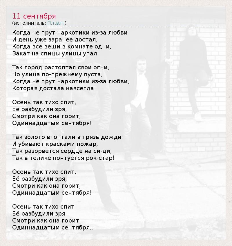 Когда не прут наркотики из-за любви И день уже заранее достал, Когда все вещи в комнате одни, Закат на спицы улицы упал. Так город растоптал свои огни, Но улица по-прежнему пуста, Когда не прут наркотики из-за любви, Которая достала навсегда. Осень так тихо спит, Её разбудили зря, Смотри как она горит, Одиннадцатым сентября! Так золото втоптали в грязь дожди И убивают красками пожар, Так разорвется сердце на си-ди, Так в телике понтуется рок-стар! Осень так тихо спит, Её разбудили зря, Смотри как она горит, Одиннадцатым сентября! Осень так тихо спит Её разбудили зря Смотри как она горит Одиннадцатым сентября...