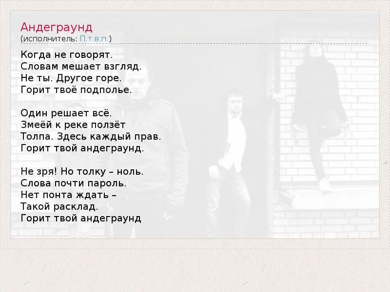 Когда не говорят. Словам мешает взгляд. Не ты. Другое горе. Горит твоё подполье. Один решает всё. Змеёй к реке ползёт Толпа. Здесь каждый прав. Горит твой андеграунд. Не зря! Но толку – ноль. Слова почти пароль. Нет понта ждать – Такой расклад. Горит твой андеграунд