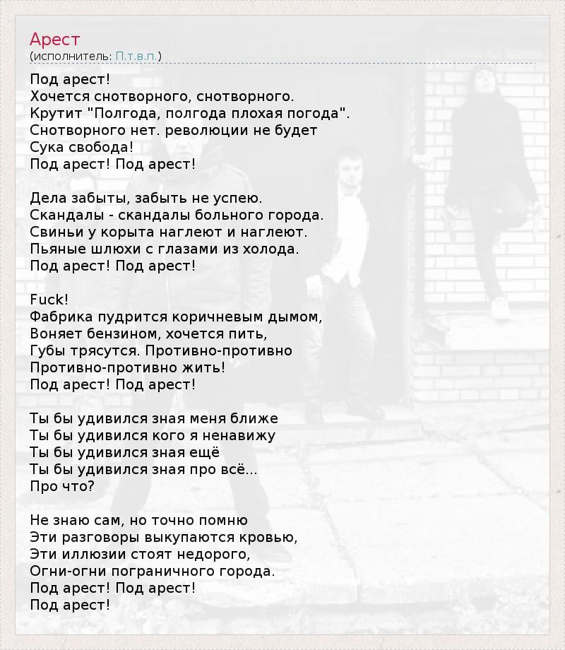 Под арест! Хочется снотворного, снотворного. Крутит "Полгода, полгода плохая погода". Снотворного нет. революции не будет Сука свобода! Под арест! Под арест! Дела забыты, забыть не успею. Скандалы - скандалы больного города. Свиньи у корыта наглеют и наглеют. Пьяные шлюхи с глазами из холода. Под арест! Под арест! Fuck! Фабрика пудрится коричневым дымом, Воняет бензином, хочется пить, Губы трясутся. Противно-противно Противно-противно жить! Под арест! Под арест! Ты бы удивился зная меня ближе Ты бы удивился кого я ненавижу Ты бы удивился зная ещё Ты бы удивился зная про всё... Про что? Не знаю сам, но точно помню Эти разговоры выкупаются кровью, Эти иллюзии стоят недорого, Огни-огни пограничного города. Под арест! Под арест! Под арест!