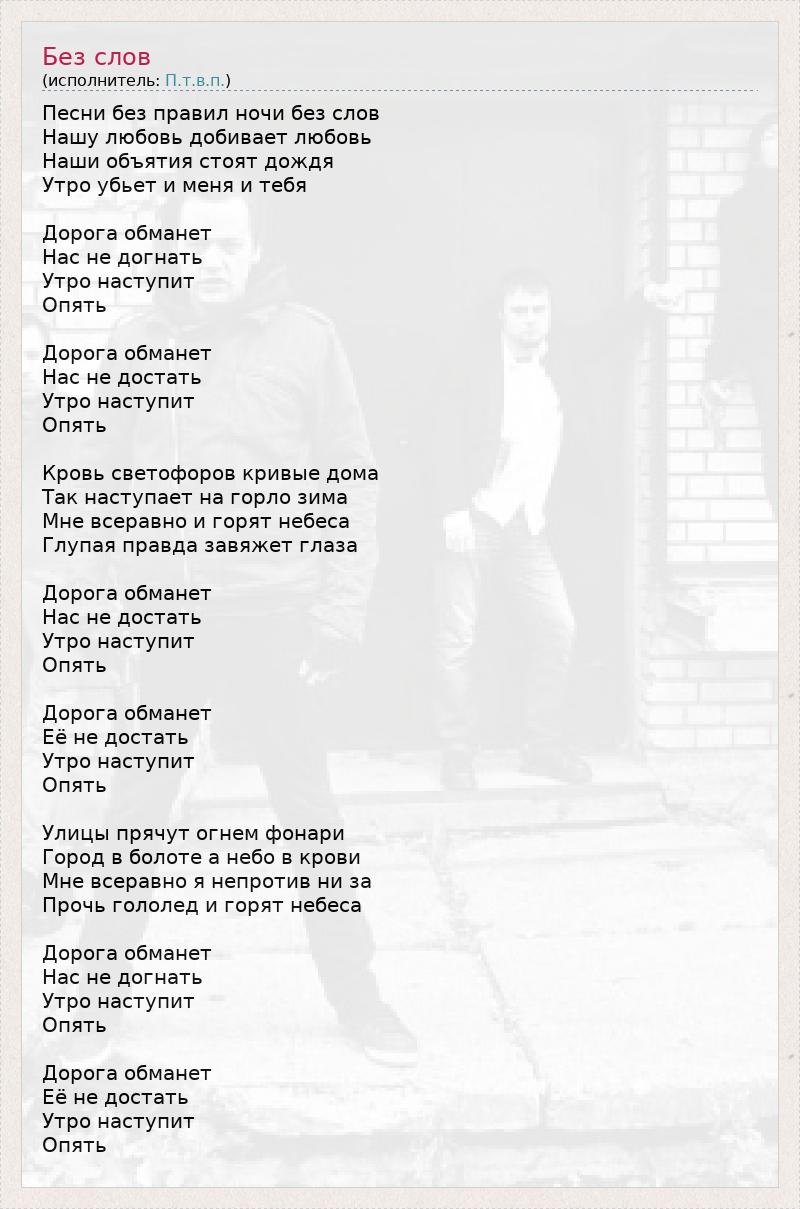 Песни без правил ночи без слов Нашу любовь добивает любовь Наши объятия стоят дождя Утро убьет и меня и тебя Дорога обманет Нас не догнать Утро наступит Опять Дорога обманет Нас не достать Утро наступит Опять Кровь светофоров кривые дома Так наступает на горло зима Мне всеравно и горят небеса Глупая правда завяжет глаза Дорога обманет Нас не достать Утро наступит Опять Дорога обманет Её не достать Утро наступит Опять Улицы прячут огнем фонари Город в болоте а небо в крови Мне всеравно я непротив ни за Прочь гололед и горят небеса Дорога обманет Нас не догнать Утро наступит Опять Дорога обманет Её не достать Утро наступит Опять