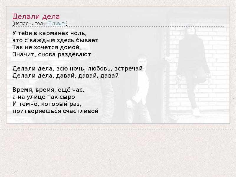 Это интересно:После́дние Та́нки В Пари́же (П. Т. В. П.) — панк-группа из Выборга, Ленинградская область, Россия. Коллектив был основан в 1996 году Алексеем Никоновым, чаще упоминаемым как Лёха Никонов.Первоначально группа была названа «Последнее танго в Париже» по одноимённому фильму (режиссёр: Бернардо Бертолуччи), позже Эдуард «Рэдт» Старков, записывая группу на выступление в клубе «TaMtAm», предложил... продолжение
