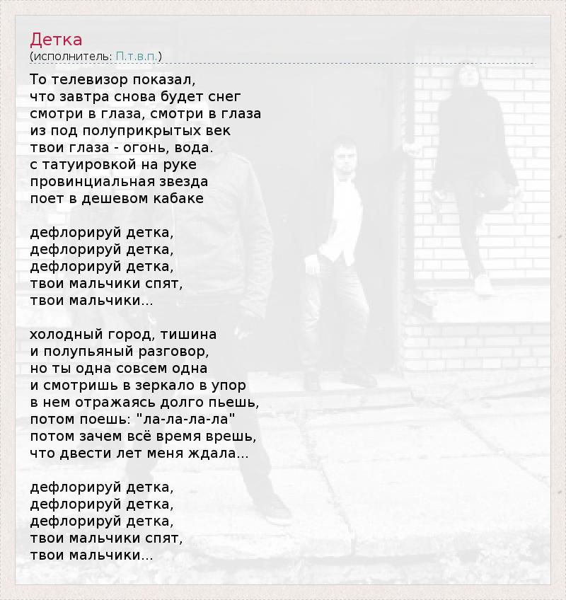 То телевизор показал, что завтра снова будет снег смотри в глаза, смотри в глаза из под полуприкрытых век твои глаза - огонь, вода. с татуировкой на руке провинциальная звезда поет в дешевом кабаке дефлорируй детка, дефлорируй детка, дефлорируй детка, твои мальчики спят, твои мальчики... холодный город, тишина и полупьяный разговор, но ты одна совсем одна и смотришь в зеркало в упор в нем отражаясь долго пьешь, потом поешь: "ла-ла-ла-ла" потом зачем всё время врешь, что двести лет меня ждала... дефлорируй детка, дефлорируй детка, дефлорируй детка, твои мальчики спят, твои мальчики...