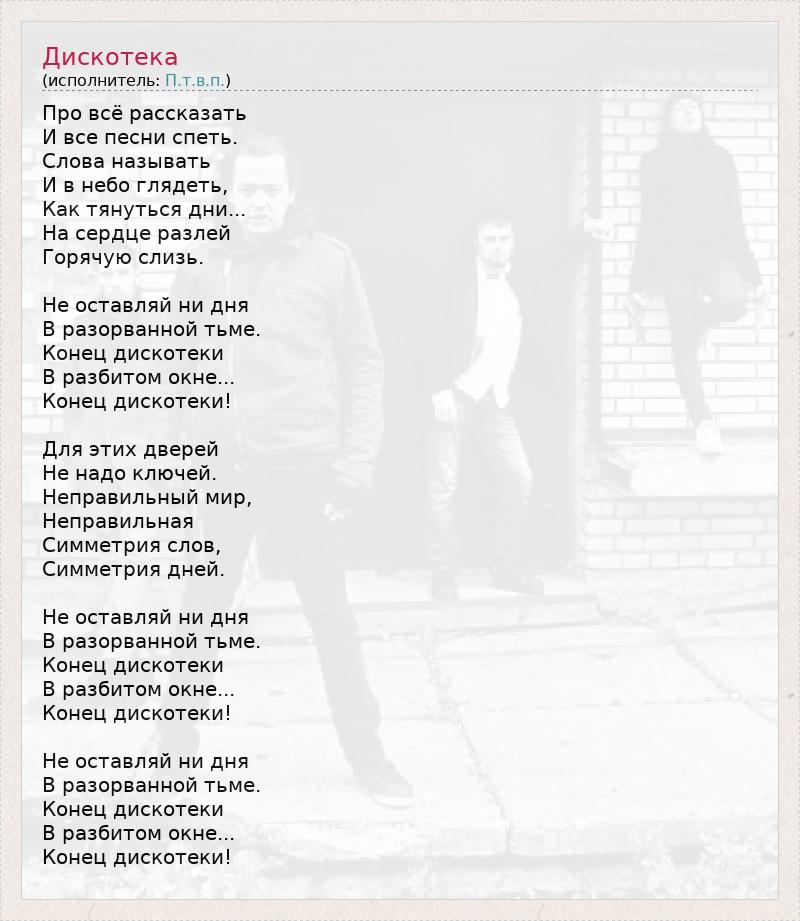 Про всё рассказать И все песни спеть. Слова называть И в небо глядеть, Как тянуться дни... На сердце разлей Горячую слизь. Не оставляй ни дня В разорванной тьме. Конец дискотеки В разбитом окне... Конец дискотеки! Для этих дверей Не надо ключей. Неправильный мир, Неправильная Симметрия слов, Симметрия дней. Не оставляй ни дня В разорванной тьме. Конец дискотеки В разбитом окне... Конец дискотеки! Не оставляй ни дня В разорванной тьме. Конец дискотеки В разбитом окне... Конец дискотеки!