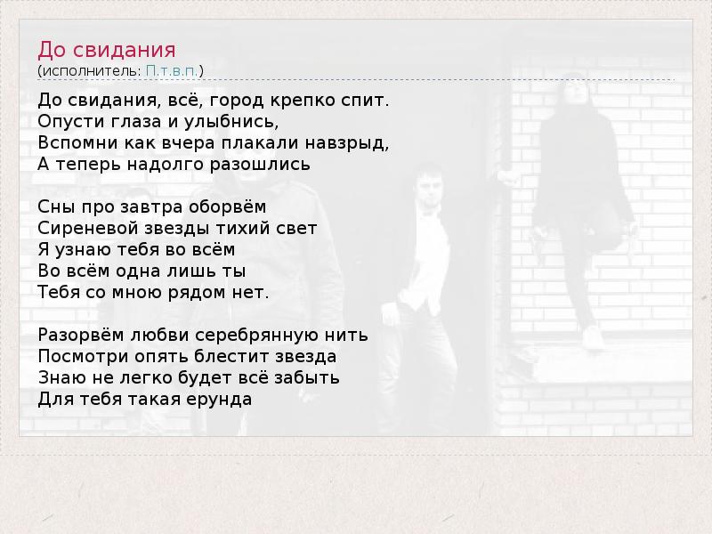 Это интересно:После́дние Та́нки В Пари́же (П. Т. В. П.) — панк-группа из Выборга, Ленинградская область, Россия. Коллектив был основан в 1996 году Алексеем Никоновым, чаще упоминаемым как Лёха Никонов.Первоначально группа была названа «Последнее танго в Париже» по одноимённому фильму (режиссёр: Бернардо Бертолуччи), позже Эдуард «Рэдт» Старков, записывая группу на выступление в клубе «TaMtAm», предложил... продолжение