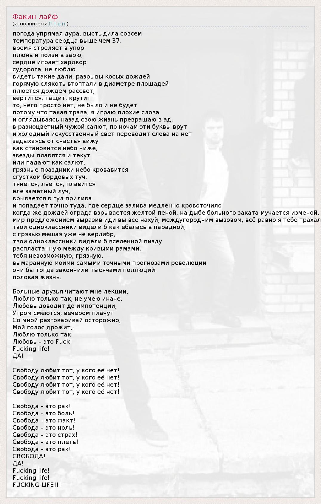 погода упрямая дура, выстыдила совсем температура сердца выше чем 37. время стреляет в упор плюнь и ползи в зарю, сердце играет хардкор судорога, не люблю видеть такие дали, разрывы косых дождей горячую слякоть втоптали в диаметре площадей плюется дождем рассвет, вертится, тащит, крутит то, чего просто нет, не было и не будет потому что такая трава, я играю плохие слова и оглядываясь назад свою жизнь превращаю в ад, в разноцветный чужой салют, по ночам эти буквы врут и холодный искусственный свет переводит слова на нет задыхаясь от счастья вижу как становится небо ниже, звезды плавятся и текут или падают как салют. грязные праздники небо кровавится сгустком бордовых туч. тянется, льется, плавится еле заметный луч, врывается в гул прилива и попадает точно туда, где сердце залива медленно кровоточило когда же дождей ограда взрывается желтой пеной, на дыбе больного заката мучается изменой. мир предложением выразив иди вы все нахуй, междугородним вызовом, всё равно я тебе трахал твои одноклассники видели б как ебалась в парадной, с грязью мешая уже не верлибр, твои одноклассники видели б вселенной пизду распластанную между кривыми рамами, тебя невозможную, грязную, вымаранную моими самыми точными прогнозами революции они бы тогда закончили тысячами поллюций. половая жизнь. Больные друзья читают мне лекции, Люблю только так, не умею иначе, Любовь доводит до импотенции, Утром смеются, вечером плачут Со мной разговаривай осторожно, Мой голос дрожит, Люблю только так Любовь – это Fuck! Fucking life! ДА! Свободу любит тот, у кого её нет! Свободу любит тот, у кого её нет! Свободу любит тот, у кого её нет! Свободу любит тот, у кого её нет! Свобода – это рак! Свобода – это боль! Свобода – это факт! Свобода – это ноль! Свобода – это страх! Свобода – это плеть! Свобода – это рак! СВОБОДА! ДА! Fucking life! Fucking life! FUCKING LIFE!!!
