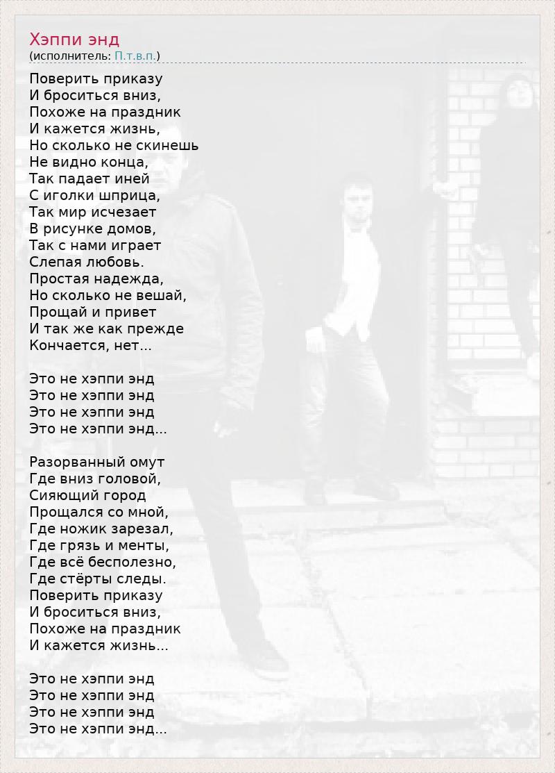 Поверить приказу И броситься вниз, Похоже на праздник И кажется жизнь, Но сколько не скинешь Не видно конца, Так падает иней С иголки шприца, Так мир исчезает В рисунке домов, Так с нами играет Слепая любовь. Простая надежда, Но сколько не вешай, Прощай и привет И так же как прежде Кончается, нет... Это не хэппи энд Это не хэппи энд Это не хэппи энд Это не хэппи энд... Разорванный омут Где вниз головой, Сияющий город Прощался со мной, Где ножик зарезал, Где грязь и менты, Где всё бесполезно, Где стёрты следы. Поверить приказу И броситься вниз, Похоже на праздник И кажется жизнь... Это не хэппи энд Это не хэппи энд Это не хэппи энд Это не хэппи энд...