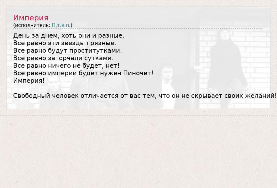 День за днем, хоть они и разные, Все равно эти звезды грязные. Все равно будут проститутками. Все равно заторчали сутками. Все равно ничего не будет, нет! Все равно империи будет нужен Пиночет! Империя! Свободный человек отличается от вас тем, что он не скрывает своих желаний!