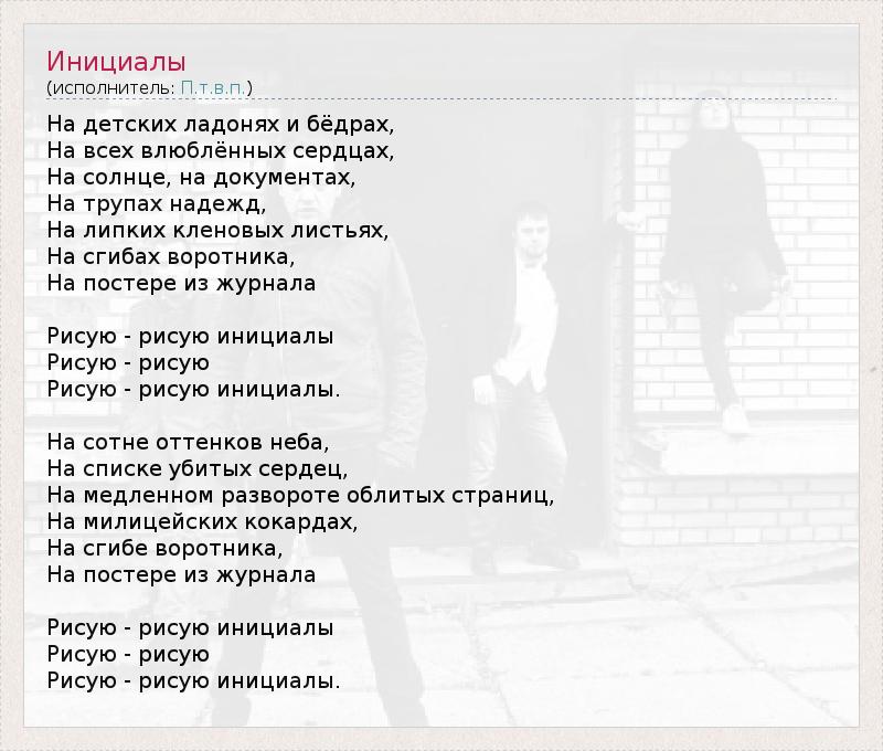 Это интересно:После́дние Та́нки В Пари́же (П. Т. В. П.) — панк-группа из Выборга, Ленинградская область, Россия. Коллектив был основан в 1996 году Алексеем Никоновым, чаще упоминаемым как Лёха Никонов.Первоначально группа была названа «Последнее танго в Париже» по одноимённому фильму (режиссёр: Бернардо Бертолуччи), позже Эдуард «Рэдт» Старков, записывая группу на выступление в клубе «TaMtAm», предложил... продолжение