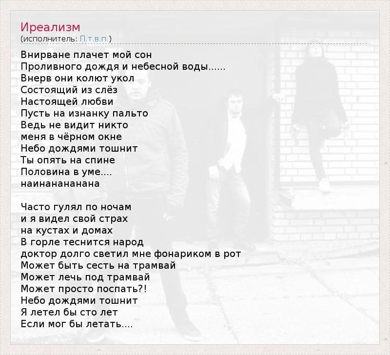 Это интересно:После́дние Та́нки В Пари́же (П. Т. В. П.) — панк-группа из Выборга, Ленинградская область, Россия. Коллектив был основан в 1996 году Алексеем Никоновым, чаще упоминаемым как Лёха Никонов.Первоначально группа была названа «Последнее танго в Париже» по одноимённому фильму (режиссёр: Бернардо Бертолуччи), позже Эдуард «Рэдт» Старков, записывая группу на выступление в клубе «TaMtAm», предложил... продолжение