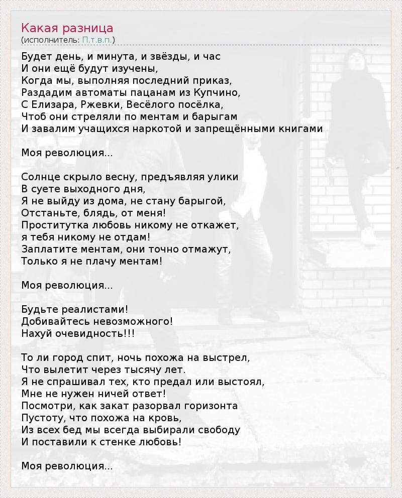 Будет день, и минута, и звёзды, и час И они ещё будут изучены, Когда мы, выполняя последний приказ, Раздадим автоматы пацанам из Купчино, С Елизара, Ржевки, Весёлого посёлка, Чтоб они стреляли по ментам и барыгам И завалим учащихся наркотой и запрещёнными книгами Моя революция... Солнце скрыло весну, предъявляя улики В суете выходного дня, Я не выйду из дома, не стану барыгой, Отстаньте, блядь, от меня! Проститутка любовь никому не откажет, я тебя никому не отдам! Заплатите ментам, они точно отмажут, Только я не плачу ментам! Моя революция... Будьте реалистами! Добивайтесь невозможного! Нахуй очевидность!!! То ли город спит, ночь похожа на выстрел, Что вылетит через тысячу лет. Я не спрашивал тех, кто предал или выстоял, Мне не нужен ничей ответ! Посмотри, как закат разорвал горизонта Пустоту, что похожа на кровь, Из всех бед мы всегда выбирали свободу И поставили к стенке любовь! Моя революция...