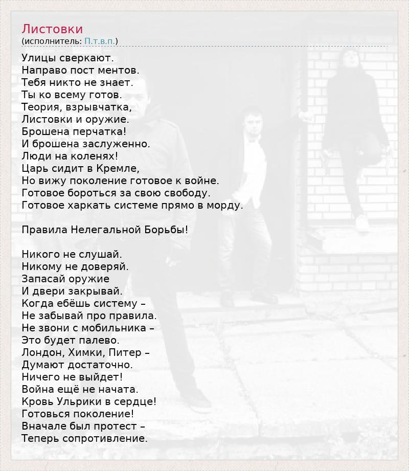 Это интересно:После́дние Та́нки В Пари́же (П. Т. В. П.) — панк-группа из Выборга, Ленинградская область, Россия. Коллектив был основан в 1996 году Алексеем Никоновым, чаще упоминаемым как Лёха Никонов.Первоначально группа была названа «Последнее танго в Париже» по одноимённому фильму (режиссёр: Бернардо Бертолуччи), позже Эдуард «Рэдт» Старков, записывая группу на выступление в клубе «TaMtAm», предложил... продолжение