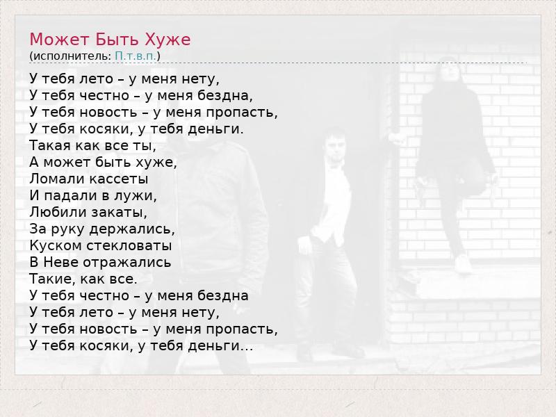 У тебя лето – у меня нету, У тебя честно – у меня бездна, У тебя новость – у меня пропасть, У тебя косяки, у тебя деньги. Такая как все ты, А может быть хуже, Ломали кассеты И падали в лужи, Любили закаты, За руку держались, Куском стекловаты В Неве отражались Такие, как все. У тебя честно – у меня бездна У тебя лето – у меня нету, У тебя новость – у меня пропасть, У тебя косяки, у тебя деньги…