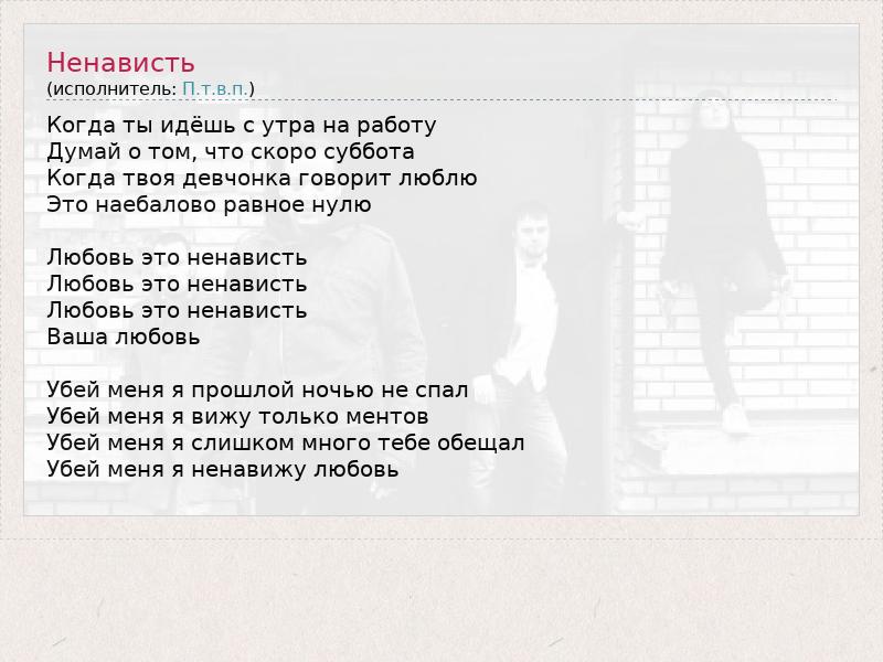 Это интересно:После́дние Та́нки В Пари́же (П. Т. В. П.) — панк-группа из Выборга, Ленинградская область, Россия. Коллектив был основан в 1996 году Алексеем Никоновым, чаще упоминаемым как Лёха Никонов.Первоначально группа была названа «Последнее танго в Париже» по одноимённому фильму (режиссёр: Бернардо Бертолуччи), позже Эдуард «Рэдт» Старков, записывая группу на выступление в клубе «TaMtAm», предложил... продолжение