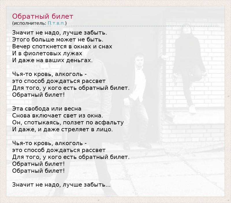 Значит не надо, лучше забыть. Этого больше может не быть. Вечер споткнется в окнах и снах И в фиолетовых лужах И даже на ваших деньгах. Чья-то кровь, алкоголь - это способ дождаться рассвет Для того, у кого есть обратный билет. Обратный билет! Эта свобода или весна Снова включает свет из окна. Он, спотыкаясь, ползет по асфальту И даже, и даже стреляет в лицо. Чья-то кровь, алкоголь - это способ дождаться рассвет Для того, у кого есть обратный билет. Обратный билет! Обратный билет! Значит не надо, лучше забыть...