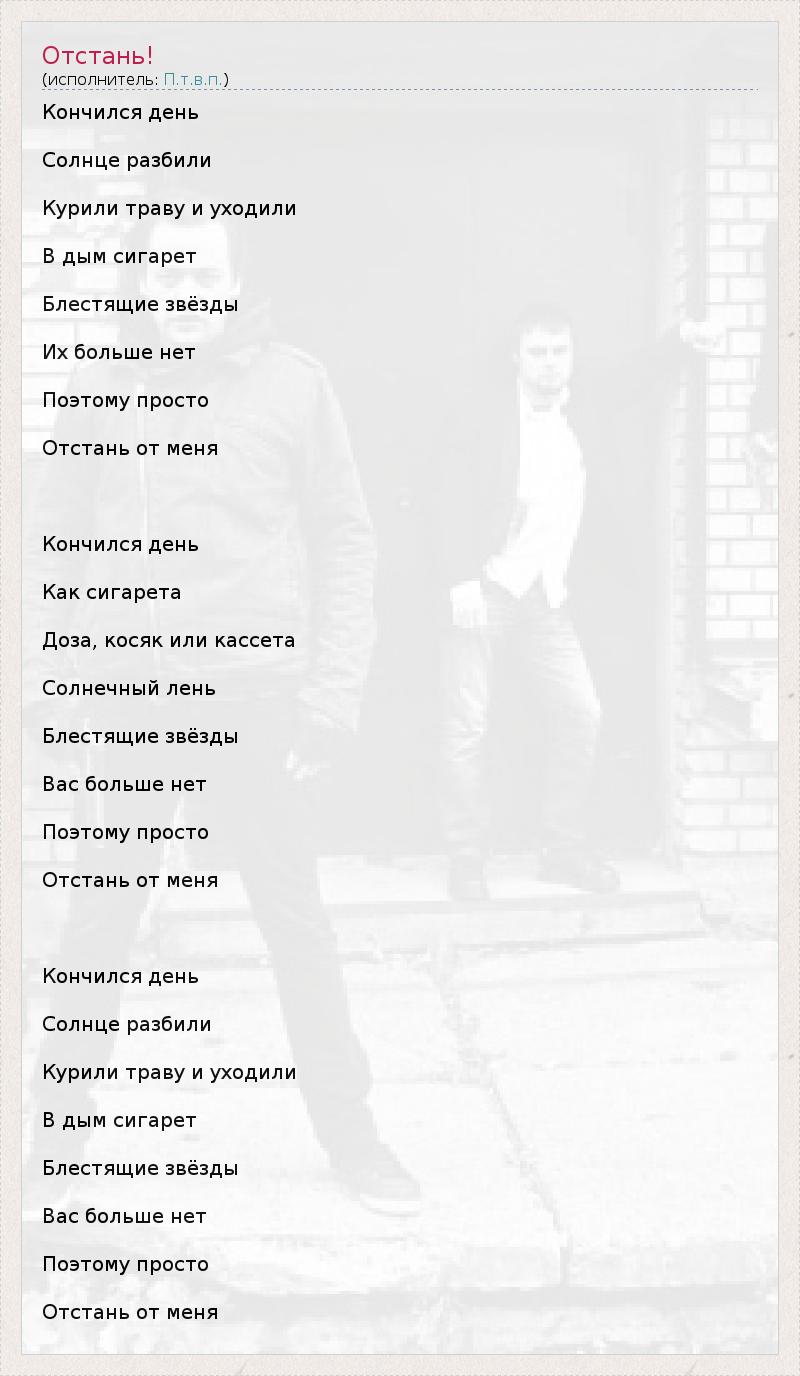 Это интересно:После́дние Та́нки В Пари́же (П. Т. В. П.) — панк-группа из Выборга, Ленинградская область, Россия. Коллектив был основан в 1996 году Алексеем Никоновым, чаще упоминаемым как Лёха Никонов.Первоначально группа была названа «Последнее танго в Париже» по одноимённому фильму (режиссёр: Бернардо Бертолуччи), позже Эдуард «Рэдт» Старков, записывая группу на выступление в клубе «TaMtAm», предложил... продолжение