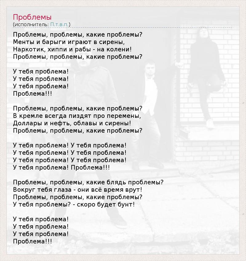 Проблемы, проблемы, какие проблемы? Менты и барыги играют в сирены, Наркотик, хиппи и рабы - на колени! Проблемы, проблемы, какие проблемы? У тебя проблема! У тебя проблема! У тебя проблема! Проблема!!! Проблемы, проблемы, какие проблемы? В кремле всегда пиздят про перемены, Доллары и нефть, облавы и сирены! Проблемы, проблемы, какие проблемы? У тебя проблема! У тебя проблема! У тебя проблема! У тебя проблема! У тебя проблема! У тебя проблема! У тебя проблема! Проблема!!! Проблемы, проблемы, какие блядь проблемы? Вокруг тебя глаза - они всё время врут! Проблемы, проблемы, какие проблемы? У тебя проблемы? - скоро будет бунт! У тебя проблема! У тебя проблема! У тебя проблема! Проблема!!!