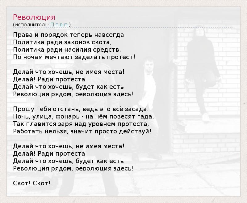 Права и порядок теперь навсегда. Политика ради законов скота, Политика ради насилия средств. По ночам мечтают заделать протест! Делай что хочешь, не имея места! Делай! Ради протеста Делай что хочешь, будет как есть Революция рядом, революция здесь! Прошу тебя отстань, ведь это всё засада. Ночь, улица, фонарь - на нём повесят гада. Так плавится заря над уровнем протеста, Работать нельзя, значит просто действуй! Делай что хочешь, не имея места! Делай! Ради протеста Делай что хочешь, будет как есть Революция рядом, революция здесь! Скот! Скот!