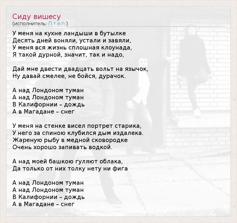 У меня на кухне ландыши в бутылке Десять дней воняли, устали и завяли, У меня вся жизнь сплошная клоунада, Я такой дурной, значит, так и надо, Дай мне двести двадцать вольт на язычок, Ну давай смелее, не бойся, дурачок. А над Лондоном туман А над Лондоном туман В Калифорнии – дождь А в Магадане – снег У меня на стенке висел портрет старика, У него за спиною клубился дым издалека. Жареную рыбу в медной сковородке Очень хорошо запивать водкой. А над моей башкою гуляют облака, Да только от них толку нету ни фига А над Лондоном туман А над Лондоном туман В Калифорнии – дождь А в Магадане – снег