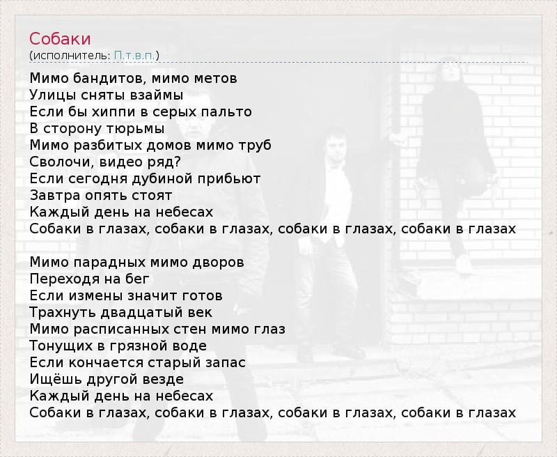 Мимо бандитов, мимо метов Улицы сняты взаймы Если бы хиппи в серых пальто В сторону тюрьмы Мимо разбитых домов мимо труб Сволочи, видео ряд? Если сегодня дубиной прибьют Завтра опять стоят Каждый день на небесах Собаки в глазах, собаки в глазах, собаки в глазах, собаки в глазах Мимо парадных мимо дворов Переходя на бег Если измены значит готов Трахнуть двадцатый век Мимо расписанных стен мимо глаз Тонущих в грязной воде Если кончается старый запас Ищёшь другой везде Каждый день на небесах Собаки в глазах, собаки в глазах, собаки в глазах, собаки в глазах