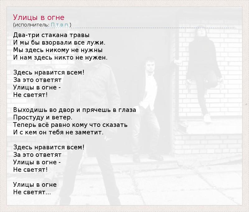 Два-три стакана травы И мы бы взорвали все лужи. Мы здесь никому не нужны И нам здесь никто не нужен. Здесь нравится всем! За это ответят Улицы в огне - Не светят! Выходишь во двор и прячешь в глаза Простуду и ветер. Теперь всё равно кому что сказать И с кем он тебя не заметит. Здесь нравится всем! За это ответят Улицы в огне - Не светят! Улицы в огне Не светят...