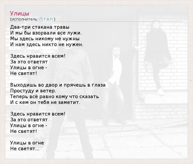 Два-три стакана травы И мы бы взорвали все лужи. Мы здесь никому не нужны И нам здесь никто не нужен. Здесь нравится всем! За это ответят Улицы в огне - Не светят! Выходишь во двор и прячешь в глаза Простуду и ветер. Теперь всё равно кому что сказать И с кем он тебя не заметит. Здесь нравится всем! За это ответят Улицы в огне - Не светят! Улицы в огне Не светят...