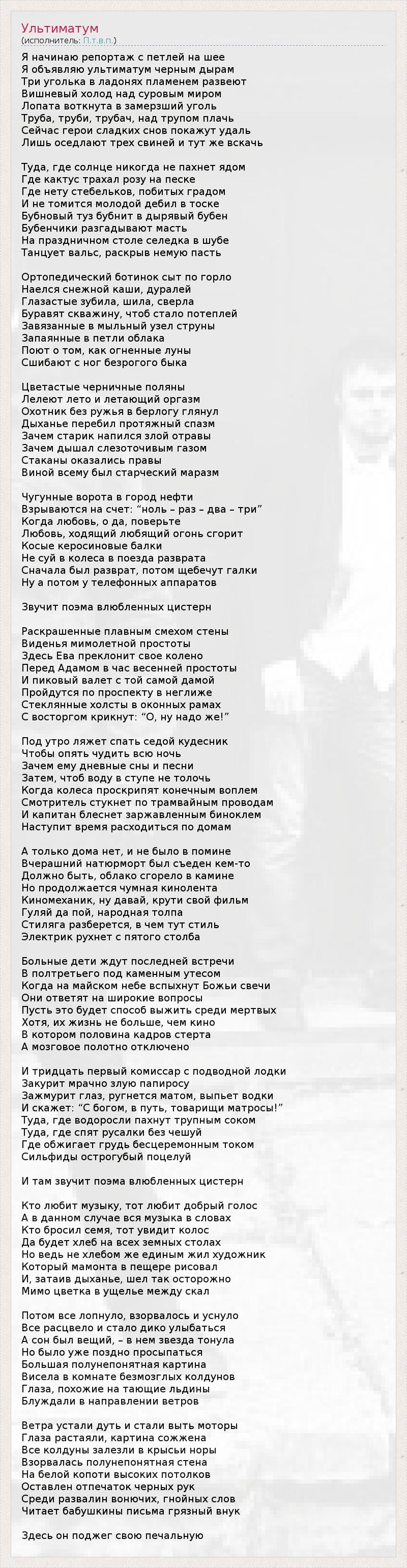 I'm starting a report with a noose around his neck I declare an ultimatum to black holes Three coals in his hands fire dispel Cherry on a cold harsh world Shovel stuck in the frozen coal Trumpet, Trumpet, trumpeter, cry over the corpse Now heroes sweet dreams show prowess Only saddled three pigs and immediately galloped There, where the sun never smell poison Where fucked cactus flower in the sand Where havent stalks , beaten by hail And not languishing young moron in anguish Ace of diamonds mutters in holey tambourine Bells unraveling suit On the festive table herring in a fur coat Dancing waltz, dumb mouth opening Orthopedic shoes fed up Ate snow porridge, fool Eyed chisels, awls , drills Auger well , that was warmer Tied into the soap node string Sealed in the loop clouds Sing about how fiery moon Knocks down hornless bull Colorful Blueberry clearing Cherished summer and flying orgasm Hunter without a gun in the den looked Interrupted breath lingering spasm Why angry old man drank poison Why breathing tear gas Glasses were right Blame was senile Cast iron gate to the city of oil Explode at the expense of " zero - one - two - three " When love , oh yeah , believe Love walked loving fire burn Slanting beams kerosene Do not stick in the wheel train of debauchery First there was corruption, then chirp jackdaws Well then have telephones Sounds poem lovers tanks Smooth painted walls laugh Fleeting vision of simplicity Here Eve will bow my knee Before Adam hour simplicity spring And the jack of spades with the very same lady Will walk along the avenue in a negligee Glass canvases in window frames With delight shout : " Oh, wow ! " Go to bed in the morning gray magician To kink again all night Why would he day dreams and songs Then, to water it down not to pound When the wheels proskripyat final cry Caretaker banging on the tram wires And the captain flash rusty binoculars The time comes to go home And only not at home and was not in sight Still yesterday was eaten by someone Must be burned in the fireplace cloud But continues to plague filmstrip Projectionist , come on , you might say his film Walk yes sing , folk crowd Dude understand, what's the style Electricians collapse of the fifth column Sick children are waiting for the last meeting At half past two under a stone cliff When the May sky draped God candles They will answer questions on a wide Let this be a way to survive among the dead Although their lives are not more than a movie In which half erased frames A cerebral canvas disabled And thirty-first Commissioner submarine Darkly lit cigarette evil Closed his eyes , rugnetsya mat drink vodka And say, " God be with you , in a way , fellow sailors ! " There, where the putrid smell of seaweed juice To where mermaids sleep without scales Where burns chest brusque current Sylphides ostroguby kiss And it sounds poem lovers tanks Who loves music , he loves a good voice And in this case, all the music in words Who threw the seed, he will see an ear Let there be bread on the tables of all earthly But not a single living bread same artist Mammoth Cave which drew And , with bated breath , walked so carefully By flower in the gorge between rocks Then they all burst exploded and fell asleep All blossomed and become wildly smiling And the dream was prophetic - it was sinking star But it was too late to wake up Large picture poluneponyatnaya Hung in the room brainless sorcerers Eyes like melting ice floe Wandered in the direction of the winds Wind blowing tired and began to howl motors Eyes melted picture burned All sorcerers climbed into a rat hole Exploded poluneponyatnaya wall On the white smoke high ceilings By mark black hands Among the ruins of the stinking , purulent words Grandma's letter reads dirty grandson Here he set fire to his sad