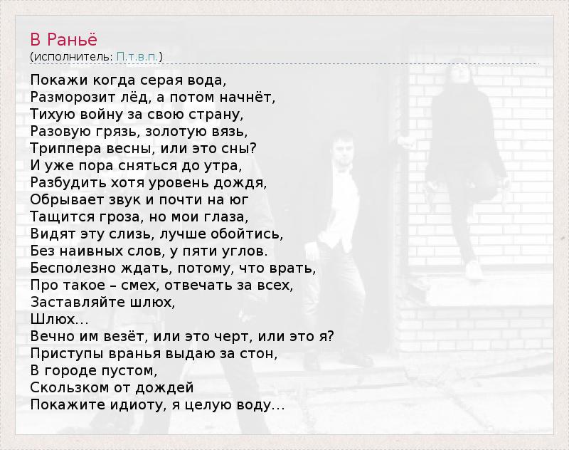 Покажи когда серая вода, Разморозит лёд, а потом начнёт, Тихую войну за свою страну, Разовую грязь, золотую вязь, Триппера весны, или это сны? И уже пора сняться до утра, Разбудить хотя уровень дождя, Обрывает звук и почти на юг Тащится гроза, но мои глаза, Видят эту слизь, лучше обойтись, Без наивных слов, у пяти углов. Бесполезно ждать, потому, что врать, Про такое – смех, отвечать за всех, Заставляйте шлюх, Шлюх… Вечно им везёт, или это черт, или это я? Приступы вранья выдаю за стон, В городе пустом, Скользком от дождей Покажите идиоту, я целую воду…