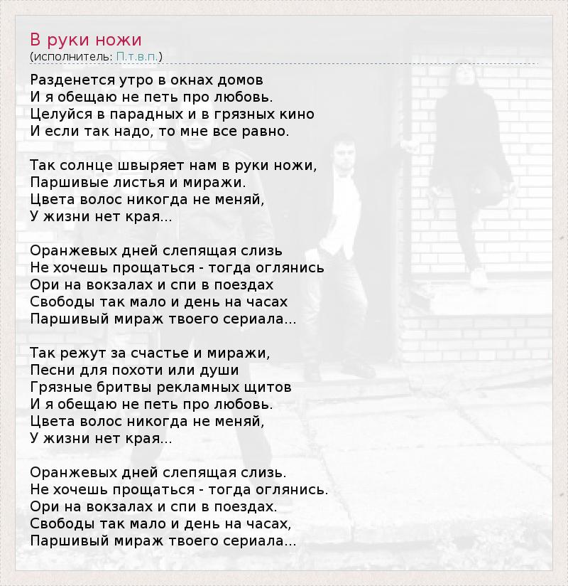 Разденется утро в окнах домов И я обещаю не петь про любовь. Целуйся в парадных и в грязных кино И если так надо, то мне все равно. Так солнце швыряет нам в руки ножи, Паршивые листья и миражи. Цвета волос никогда не меняй, У жизни нет края... Оранжевых дней слепящая слизь Не хочешь прощаться - тогда оглянись Ори на вокзалах и спи в поездах Свободы так мало и день на часах Паршивый мираж твоего сериала... Так режут за счастье и миражи, Песни для похоти или души Грязные бритвы рекламных щитов И я обещаю не петь про любовь. Цвета волос никогда не меняй, У жизни нет края... Оранжевых дней слепящая слизь. Не хочешь прощаться - тогда оглянись. Ори на вокзалах и спи в поездах. Свободы так мало и день на часах, Паршивый мираж твоего сериала...