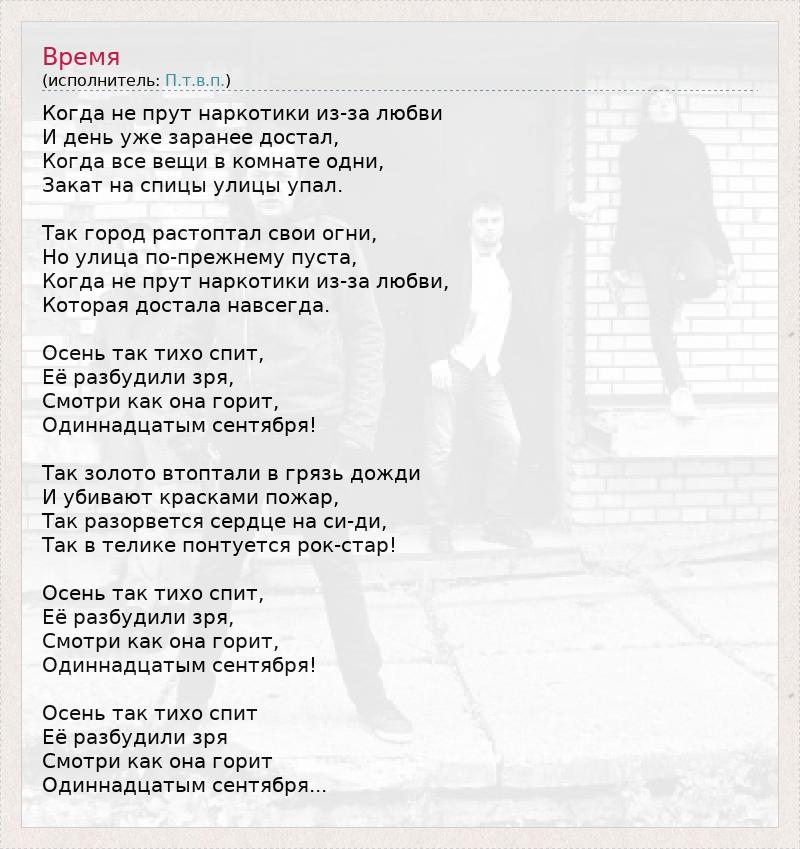 Это интересно:После́дние Та́нки В Пари́же (П. Т. В. П.) — панк-группа из Выборга, Ленинградская область, Россия. Коллектив был основан в 1996 году Алексеем Никоновым, чаще упоминаемым как Лёха Никонов.Первоначально группа была названа «Последнее танго в Париже» по одноимённому фильму (режиссёр: Бернардо Бертолуччи), позже Эдуард «Рэдт» Старков, записывая группу на выступление в клубе «TaMtAm», предложил... продолжение